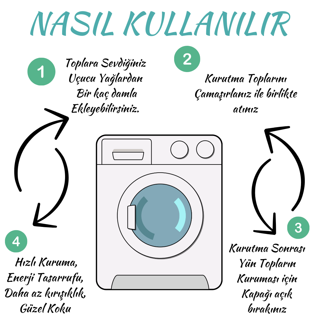 Yün Kurutma Topları plastik toplara göre çok sessizdirler. Yün, nem çekme özelliği ile bilinir, makine içerisinde her bir top yaklaşık 130 gr suyu emer böylece enerji ve zamandan tasarruf edilmiş olur. Çamaşırların aralarını açtığı için sıcak havanın daha rahat dolaşmasını sağlayarak kurutmayı kolaylaştırır. Çamaşırlarınız daha az kırışacağı için ütülemeden ve zamandan da tasarruf sağlamış olursunuz. Kurutma sonrası oluşan elektriklenmeyi alır.